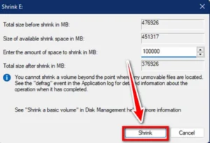 Bạn nhập số dung lượng muốn tách ra (đơn vị thường là MB). Bạn kiểm tra lại con số để đảm bảo hợp lý. Ví dụ, bạn muốn tạo ổ mới 100 GB thì bạn nhập khoảng 102400 MB). Khi nhập xong kích thước cho ổ mới, bạn hãy nhấn Shrink để xác nhận.