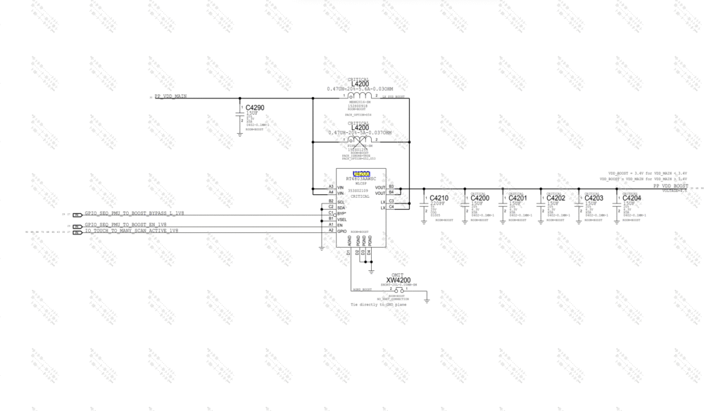 PP_VDD_BOOST trên iPhone 12 Pro Max là đường nguồn điện áp đầu ra của mạch Boost Converter — mạch này có nhiệm vụ tăng áp từ pin (khoảng 3.8V) lên mức điện áp cao hơn để cấp cho các linh kiện cần điện áp lớn, chủ yếu là: