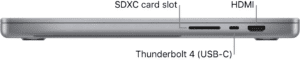 - Cổng kết nối: 3 cổng Thunderbolt 4, HDMI, khe thẻ SDXC, jack tai nghe 3.5mm, MagSafe 3.